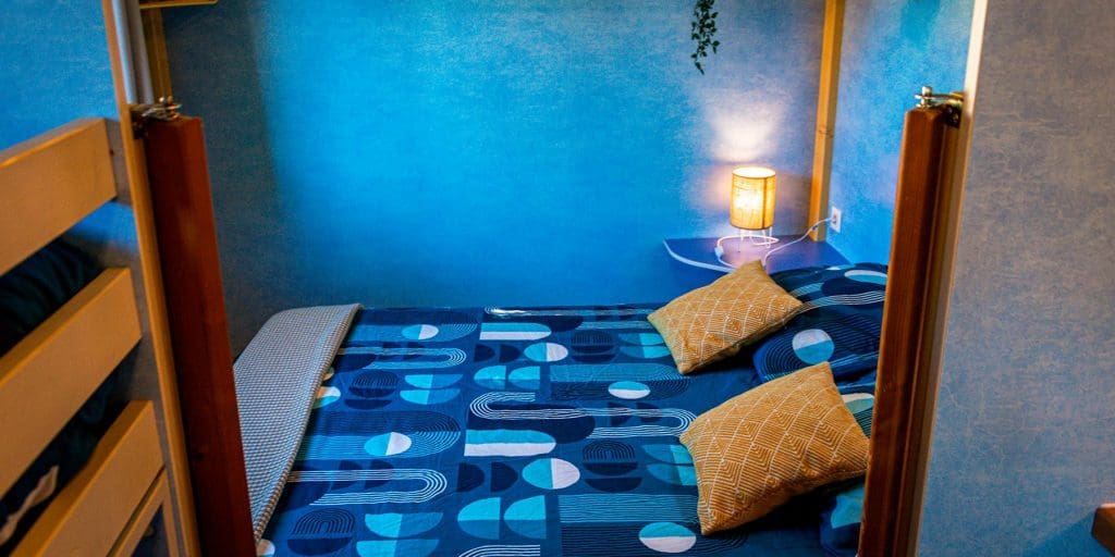 - 1 space in the bottom of the caravan separated by swinging doors with a double bed 140×190 cm equipped with a mattress protector, a drawsheet, a duvet and two protected pillows.