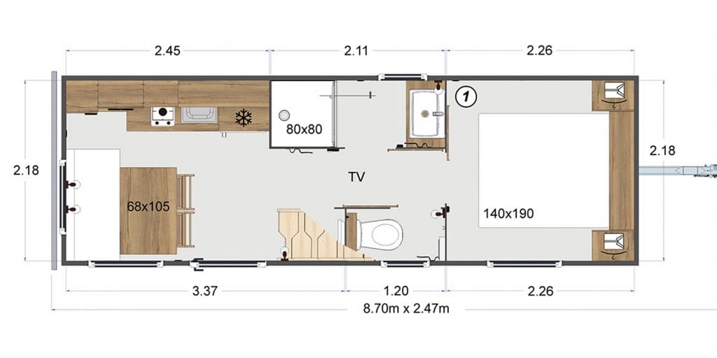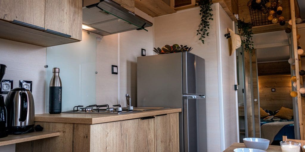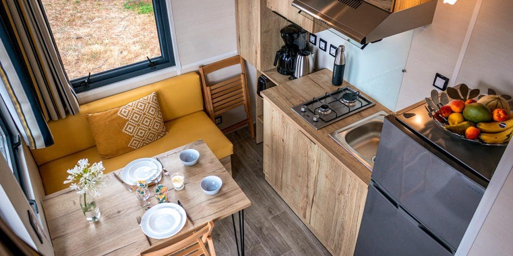 This 22 m2 tiny house (15 m2 + 7 m2floor) is perfect for a family or two couples of friends looking for a bohemian and comfortable experience. It is situated under a pine forest