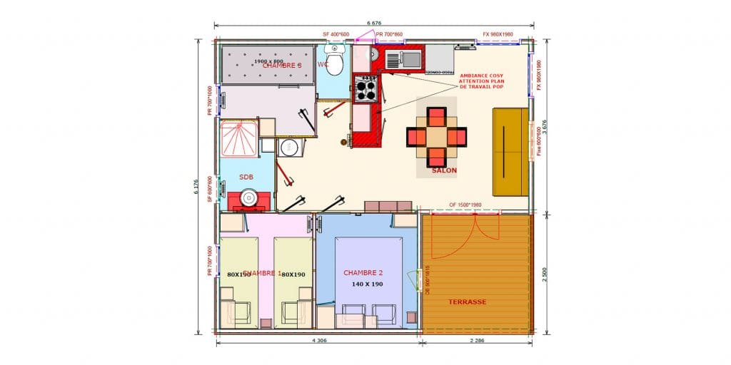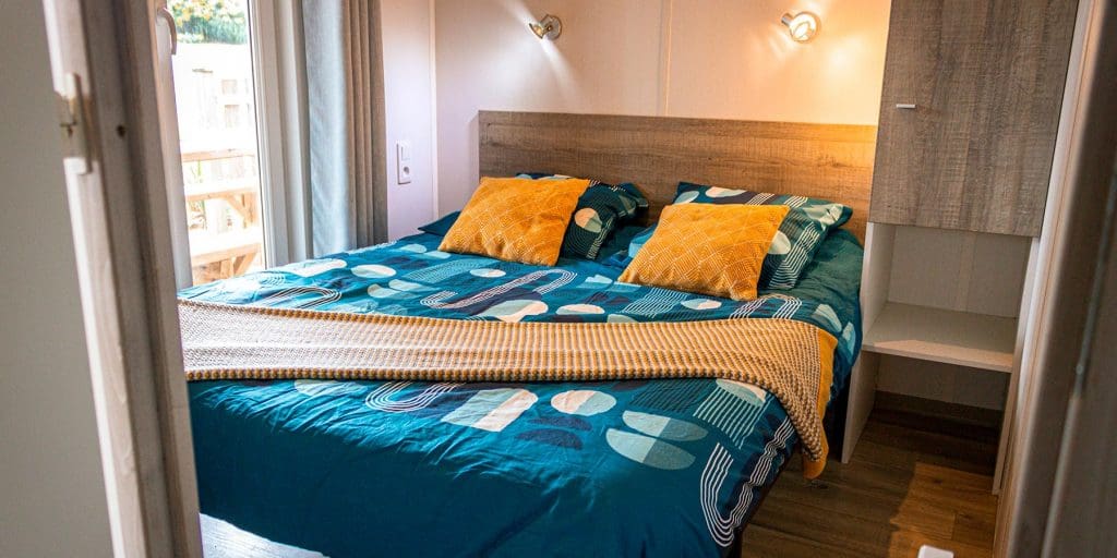 Il est agrémenté d’une terrasse couverte qui vous permettra de profiter du cadre verdoyant du camping.