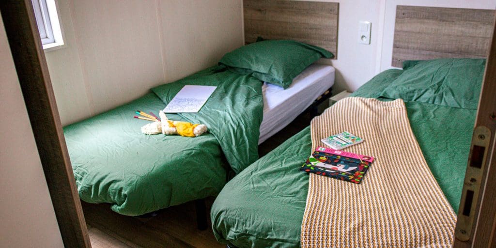 - 1 chambre avec deux lits simples 80×190 cm équipés chacun d’une protection de matelas, d’une alèse, d’une couette et d’un oreiller protégé.