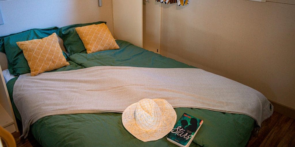 - 1 chambre avec un lit double 140×190 cm équipé d’une protection de matelas, d’une alèse, d’une couette et de deux oreillers protégés.