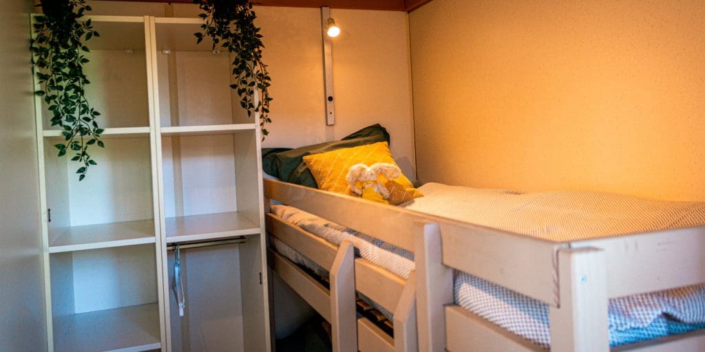 - 1 chambre avec deux lits superposés 80×190 cm équipés chacun d’une protection de matelas, d’une alèse, d’une couette et d’un oreiller protégé.