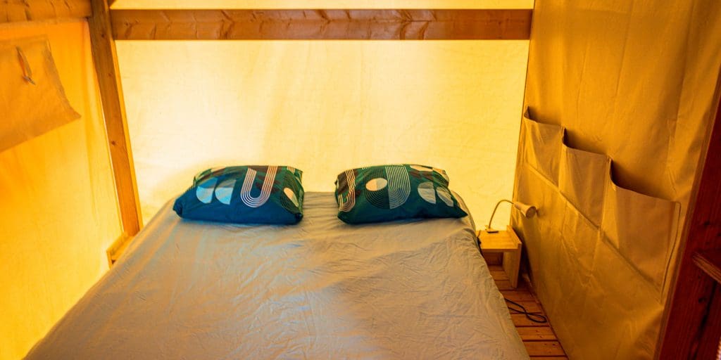 Venez goûter à la vie du glamping à Belle-Île-en-Mer, sous une tente lodge aménagée grand confort avec une vraie literie. Une expérience insolite au cœur de notre pinède pour tous les amoureux de la nature.