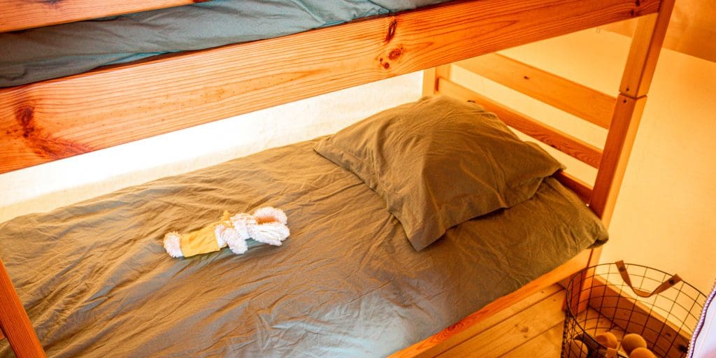 - 1 chambre avec deux lits superposés 80×190 cm tous équipés d’une protection de matelas, d’une alèse, d’une couette et de deux oreillers protégés.