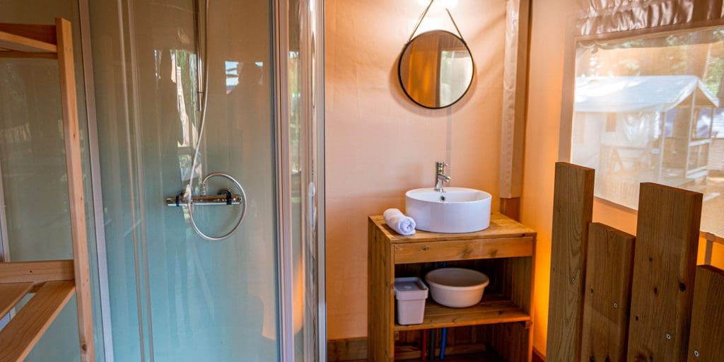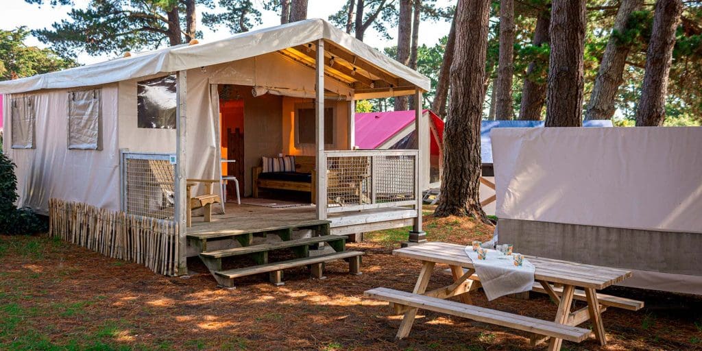 Venez goûter à la vie du glamping à Belle-Île-en-Mer, sous une tente lodge aménagée grand confort avec une vraie literie et une salle de bain privative.